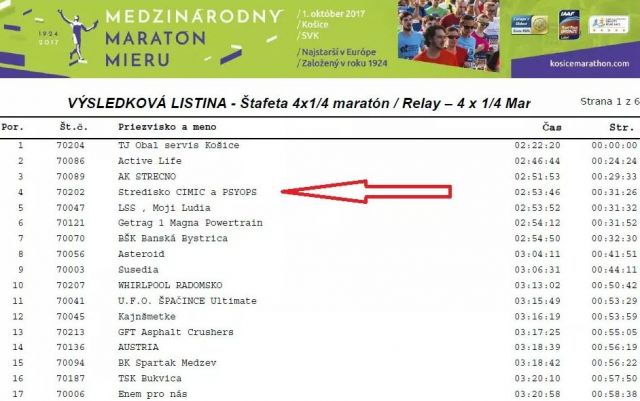V tvrdej konkurencii 223 registrovaných tímov skončil tím pod názvom „Stredisko CIMIC a PSYOPS“ v kategórii Štafeta 4x1/4 maratón s časom 2 hod. 53 min. 46 sek. na fantastickom 4. mieste.