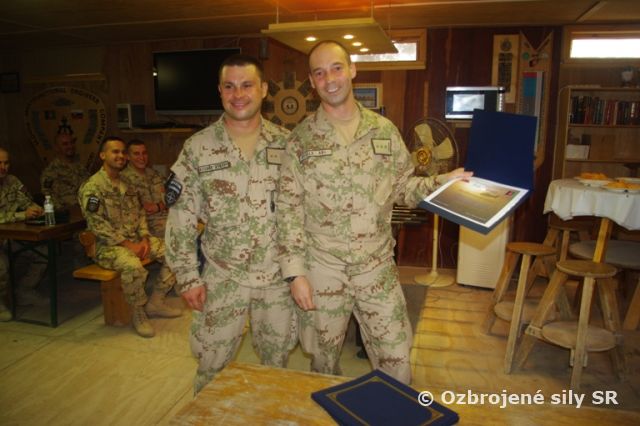 Pri príležitosti ukončenia pôsobenia vo vojenskej operácii ISAF veliaci poddôstojník slovenského kontingentu ISAF štábny nadrotmajster Rastislav BODNÁR ocenil pamätným odznakom vojenského veterána a ďakovným listom najlepších príslušníkov slovenského kontingentu z radov poddôstojníkov a vojakov mužstva. Vybrať najlepších desiatich vojakov z vyše stovky odchádzajúcich príslušníkov strážnej jednotky KAF, multifunkčnej ženijnej roty a strážnej jednotky Tarin Kowt nebolo vôbec ľahké, lebo všetci svojou službou potvrdili vysokú profesionalitu, pozitívnu odbornú aj ľudskú stránku svojej osobnosti. O tom svedčia aj slová chvály z úst samotného veliteľa vojenskej základne KAF (Kandahar Airfield), brigádneho generála Scotta DENNISA, ktoré povedal počas slávnostného ceremoniálu udeľovania medailí za službu vo vojenskej operácii ISAF v Afganistane. A ako dodal počas svojho príhovoru veliaci poddôstojník slovenského kontingentu, je hrdý na slovenských vojakov, keď z úst svojich kolegov, veliacich poddôstojníkov partnerských armád, počas neformálnych rozhovorov počúva slová chvály a uznania na adresu našich vojakov.